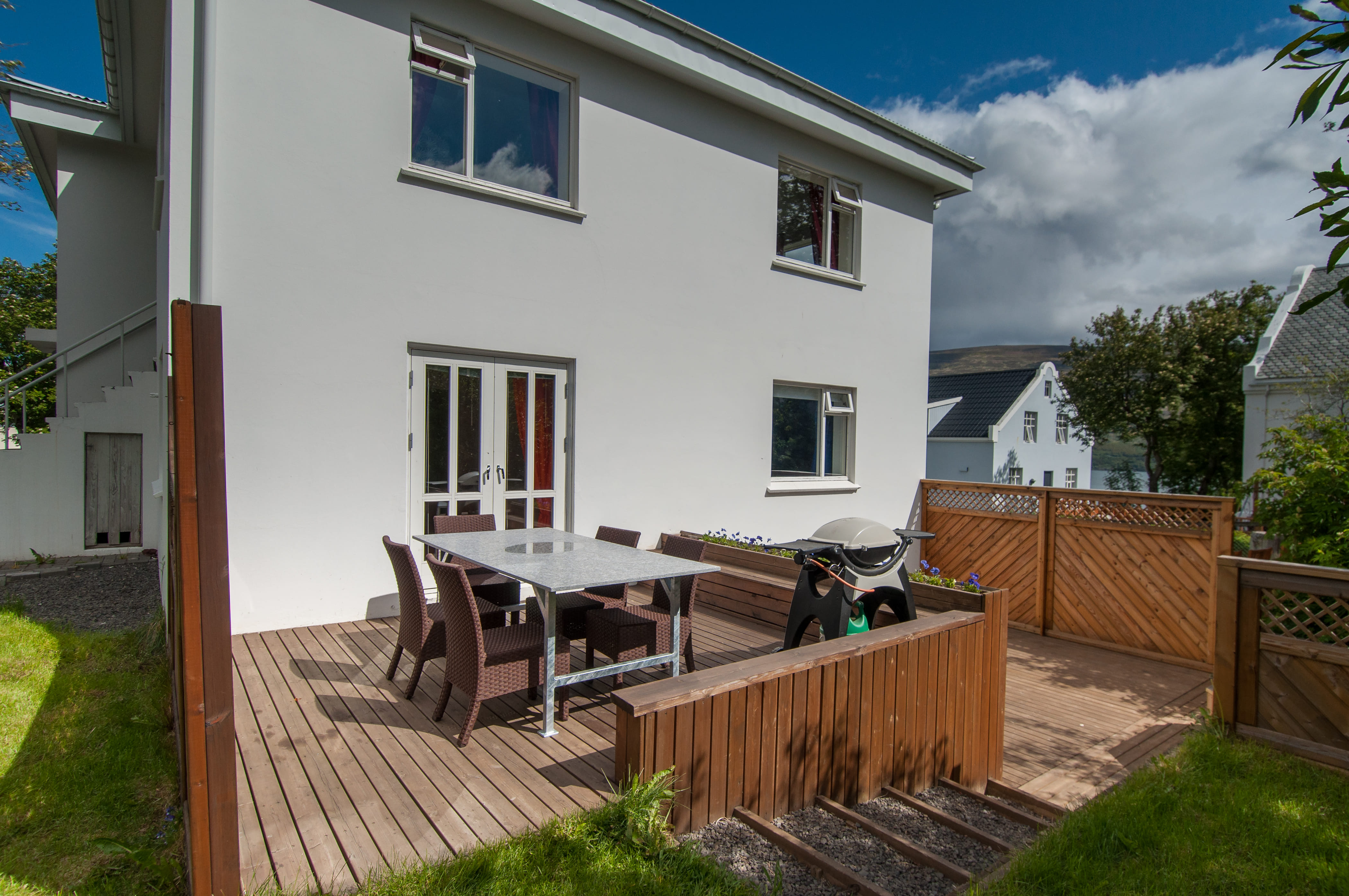Björt og rúmgóð íbúð með heitum potti til einkanota, palli og garði. Stofa og borðstofa eru rúmgóð og gott útsýni er yfir Eyjafjörð. Íbúðin rúmar 5 manns í 3 svefnherbergjum. Einungis steinsnar frá íbúðinni er Lystigarðurinn, sem er einstakur svo norðarlega í heiminum.