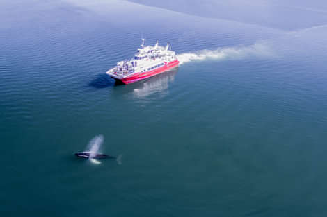 Our specially trained whale watching guides are experts at spotting them and telling you all about their behaviour, any question you have, we promise you an answer. Our ship is the only high speed, specially modified, whale watching ship in Iceland. Capable of carrying 200 persons with spectacular views from our “cinema styled” viewing platforms. Its speed guarantees availability of whale watching tours from Akureyri, where ever the whales might be located in the deepest fjord in Iceland. With ample indoor and outdoor seating, bar and cafeteria, you can be sure that the ride is comfortable and pleasant even at speed.Hólmasól is the first high speed whale watching ship in Iceland, equipped with plenty of indoor and outdoor seating, lavatories and an on board bar & cafeteria. The specially designed viewing platform on the front of the ship is ideal for wildlife watching. *Depending on the conditions and booking status of the day, we may use one of three different sized vessels for this tour. Please check with our team on site.